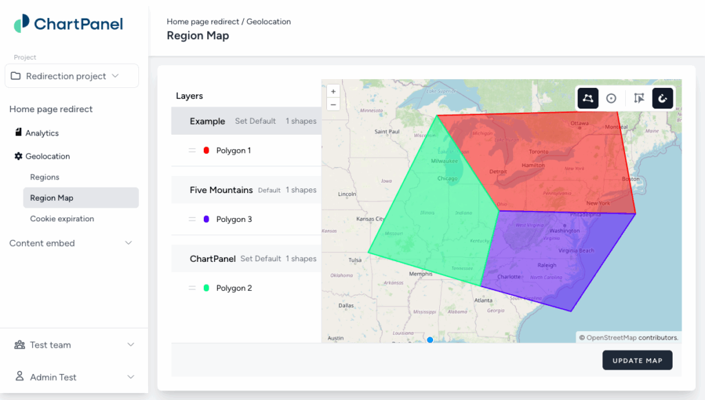 To set or change the geographic area within which visitors will be sent to a given URL, find the map setting in the left in the channel you are trying to edit.